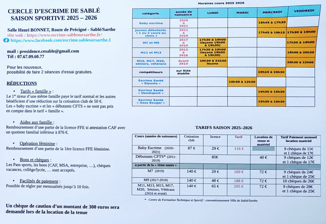 le mercredi de 19 h 15 à 20 h 30 selon liste établi par le Maître d'arme